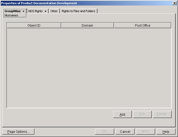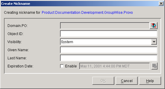 Domain.PO: Select the post office where you want to assign the nickname. This can be any post office in your GroupWise system; it does not have to be the distribution list's post office.