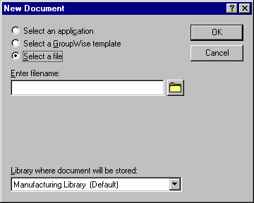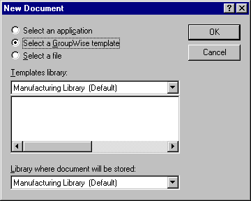 When you create a new document using File > New > Document, GroupWise prompts you to select a template for the document. You can use an application's template, a GroupWise template, or a file on disk as the foundation for your new document.