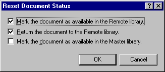 When you use Reset Document Status in Remote or Caching mode, you can specify whether or not you want to return the document to the Master Library. Use the Make the Document Available in the Master Library option to remove the In Use status and make the document available in the Master Library without updating the document.