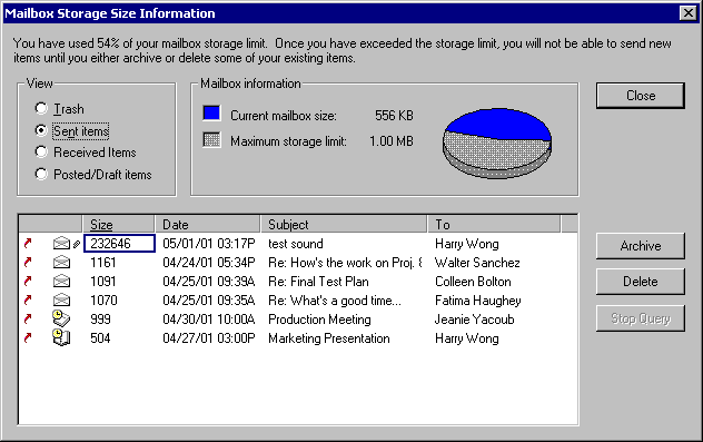When you select a view, GroupWise searches for items in the selected folder and displays the items in descending order, from the largest file size to the smallest. You can click Stop Query at any time to stop the query.