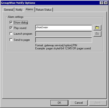 You can set an alarm in your mailbox or calendar to notify you about the status of a message through an electronic paging device. Notify must be running for you to receive notification of alarms, incoming items, or a change in status of outgoing items.