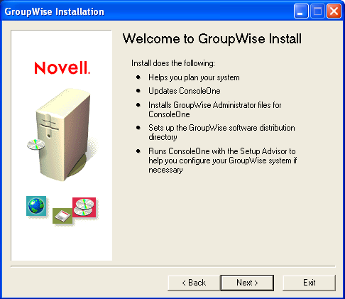 Click , then click to accept the license agreement and display the Welcome to GroupWise Install dialog box.