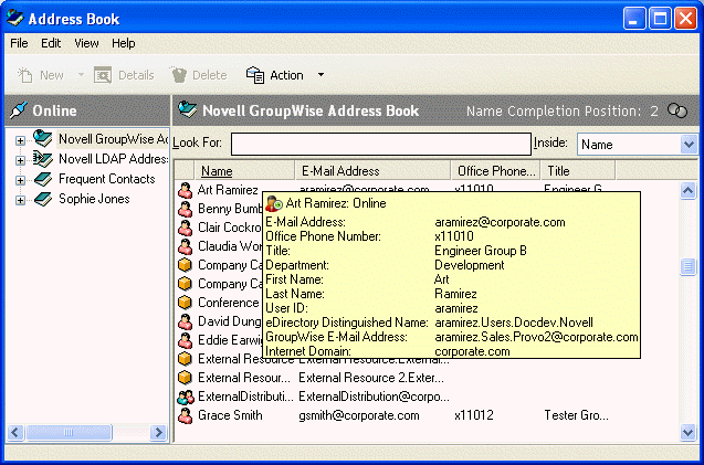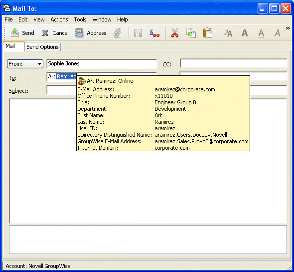 Summary information about users is displayed in an address book and in the Address Selector when you position your mouse pointer over that name. The same information will display in the To, CC, BC, or From fields of a message if you first click on the name. This display is called Quick Info.