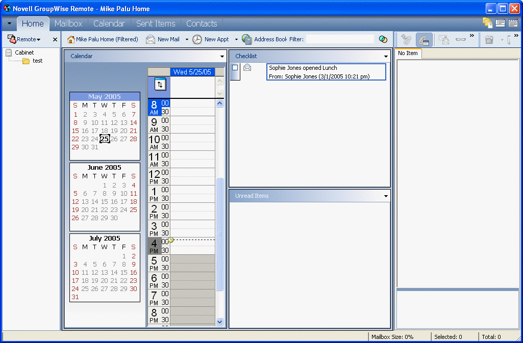 Remote mode is familiar to GroupWise® users who use Hit the Road. Similar to Caching mode, a copy of your network mailbox, or the portion of the mailbox you specify, is stored on your local drive. You can retrieve and send messages on a periodic basis with the type of connection you specify (modem, network, or TCP/IP). If you do not want a complete copy of your network mailbox, you can restrict what is retrieved, such as only new messages or only message subject lines.