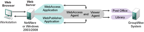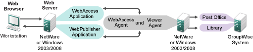 The WebAccess Application and WebPublisher Application can be installed to a NetWare, Linux, or Windows Web server. If desired, you can install the WebAccess Agent and the Viewer Agent on the same server with the Web server.