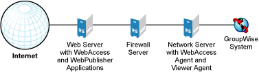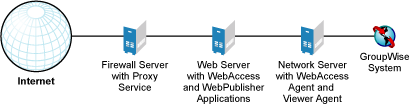 If your firewall does not provide a proxy service, you need to install the WebAccess Application and WebPublisher Application to a Web server that is outside the firewall. Because the WebAccess Agent requires direct access (mapped drive or UNC path) to a GroupWise domain directory, it needs to be installed to a server that is located within the firewall.