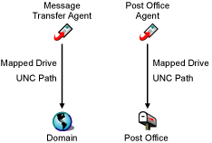 Figure 3-8 MTA with UNC Path or Mapped Drive to Domain and Post Office Directories; POA with UNC Path or Mapped Drive to the Post Office Directory
