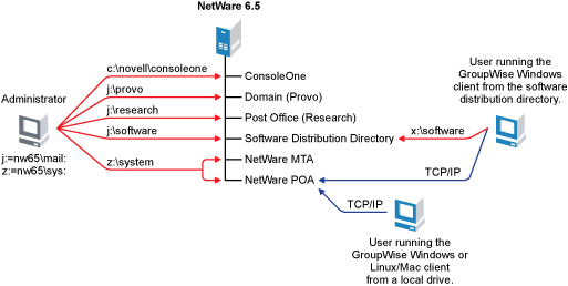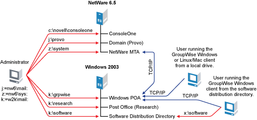 The following diagram shows the domain and MTA on a NetWare 6.5 server. The post office, software distribution directory, and POA are on a Windows Server 2003 machine. The MTA communicates with the POA through TCP/IP.