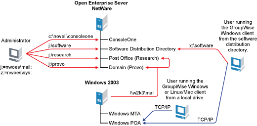 The following diagram shows the domain, post office, and software distribution directory on a server running the NetWare version of Novell Open Enterprise Server (OES). The MTA and POA, located on a Windows Server 2003 machine, use a UNC path to access the domain directory and post office directory on the OES NetWare server.