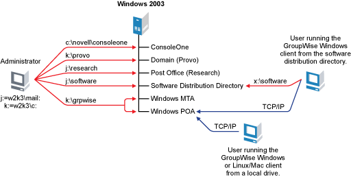 The following diagram shows all GroupWise components on Windows Server 2003.