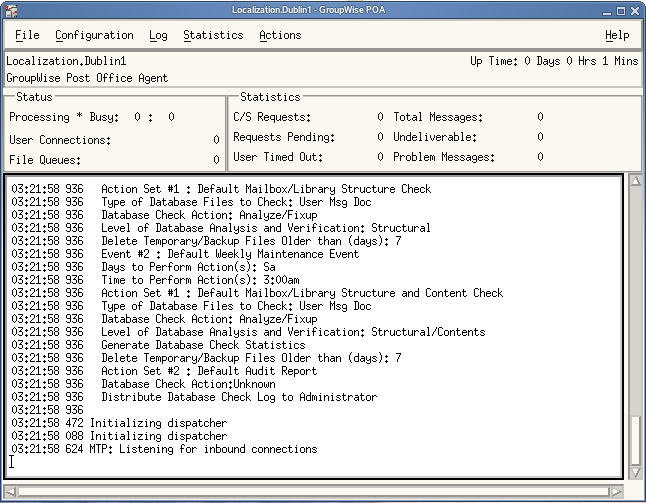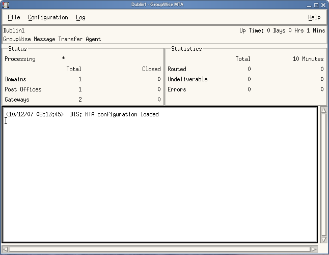 The --show startup switch starts the MTA with a server console interface similar to that provided for the NetWare and Windows MTAs. This user interface requires that the X Window System and Open Motif be running on the Linux server.