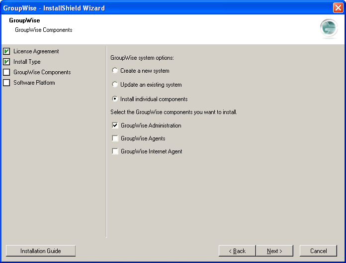 Click , click to accept the License Agreement, then click to display the GroupWise Components page.