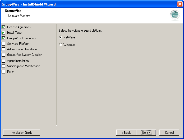 If you are setting up your basic GroupWise system on NetWare, you can run the Installation program from any Windows machine that meets the administrator machine requirements listed in Section 2.1, GroupWise Administration Requirements. |