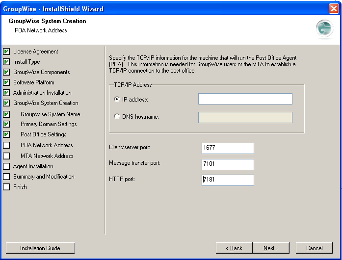 After the GroupWise Installation program has gathered eDirectory information, it is ready to gather GroupWise agent information.