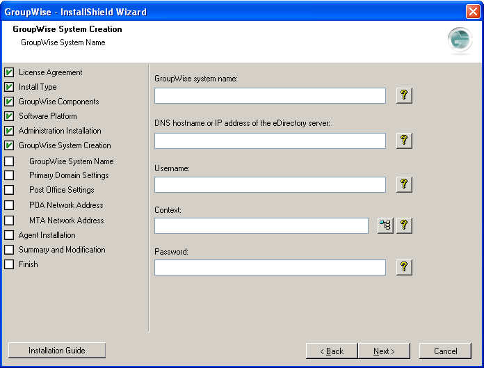 After the GroupWise Installation program has gathered this administrative information, it is ready to gather information about the eDirectory tree and the GroupWise objects to create.
