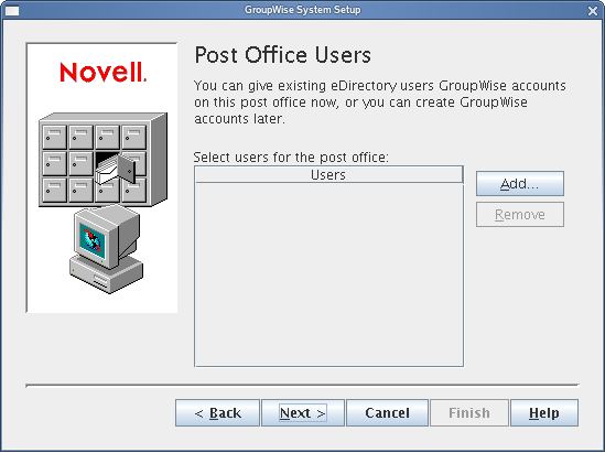 When you have provided the system, domain, post office, and agent information for your GroupWise system, you are ready to create users. However, adding users at this point is optional. After the Installation program has finished, you can add users to the post office at any time by using ConsoleOne. We recommend that you just add two test users at this time.