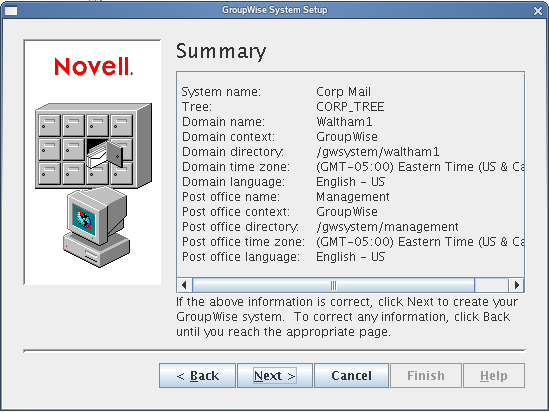 After you have verified that the information you entered is correct, you are ready to create your GroupWise system.