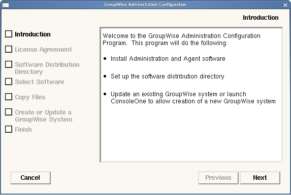 The X Window System is required for running the GUI GroupWise Installation program. If you are not using the X Window System, you can install GroupWise components individually, as described in Installing the GroupWise Agents Using the Text-Based Installation Program. However, you must use the GUI GroupWise Installation program to create your basic GroupWise system.