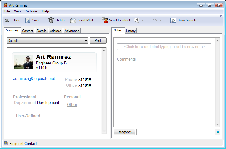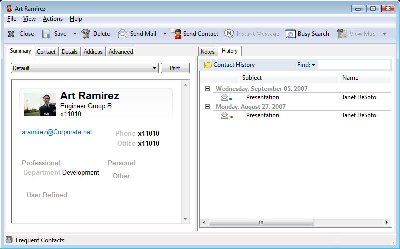 History: Displays all the items you have sent to or received from this contact, unless the items have been archived. You can use Quick Find to create custom searches in the History. For additional information on using Quick Find, see Section 7.0, Finding Items.