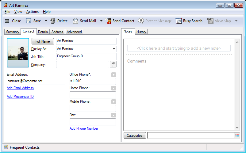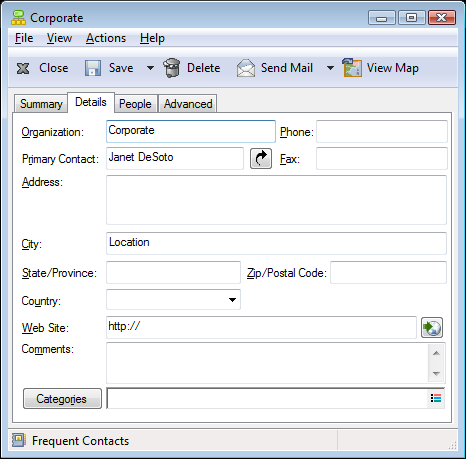Details: Use this page to specify the contact’s profession, department, location, manager, assistant, birthday, anniversary, spouse, children, hobbies, and any Internet addresses associated with the contact.
