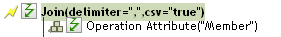 Joins the values of the nodes in the node set result of the enclosed tokens, separating the values by the characters specified by delimiter. If the comma-separated values (CSV) are true, then CSV quoting rules are applied to the values.