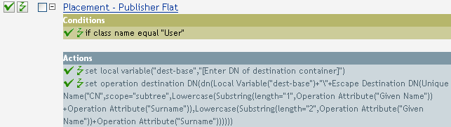 The example is from the predefined rules that come with Identity Manager. For more information, see Section 6.16, Placement - Publisher Flat. To view the policy in XML, see predef_place_pub_flat.xml.
