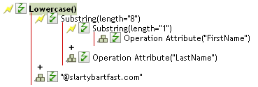This example sets the e-mail address to be name@slartybartfast.com where the name equals the first character of the Given Name plus the Surname. The policy name is Policy: Create E-mail from Given Name and Surname, and it is available for download at the Novell Support Web site. For more information, see