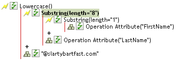 The Substring token is used twice in the action Set Destination Attribute Value. It takes the first character of the First Name attribute and adds eight characters of the Last Name attribute together to form one substring.