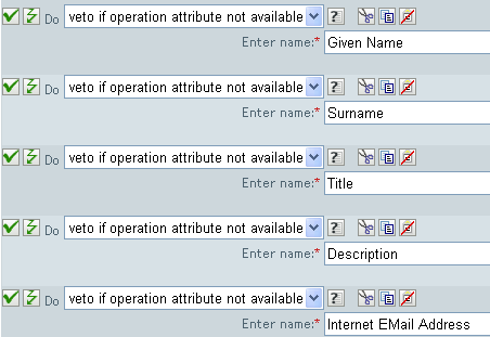 The actions vetoes the operation if the attributes of Given Name, Surname, Title, Description, and Internet Email Address are not available.