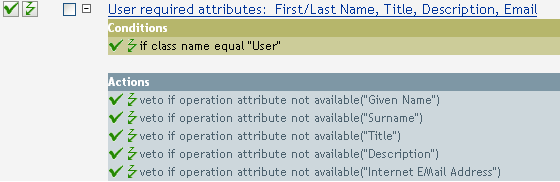The example does not allow User objects to be created unless the attributes Given Name, Surname, Title, Description, and Internet EMail Address are available. The policy name is Policy to Enforce the Presences of Attributes, and it is available for download from the Novell Support Web site. For more information, see