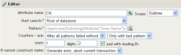 A pattern can be tested with or without a counter as indicated by counter-use and counter-pattern. When a pattern is tested with a counter, the pattern is tested repeatedly with an appended counter until a name is found that does not return any instances or the counter is exhausted. The counter starting value is specified by counter-start and the counter maximum value is specified in terms of the maximum number of digits as specified by counter-digits. If the number of digits is less than those specified, then the counter is right-padded with zeros unless the counter-pad attribute is set to false. The counter is considered exhausted when the counter can no longer be represented by the specified number of digits.