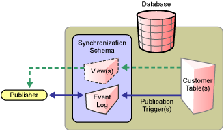 When customer tables are updated, synchronization triggers update the intermediate staging tables. Publication triggers then insert one or more rows into the event log table. The Publisher channel then reads the inserted rows and updates the Identity Vault.