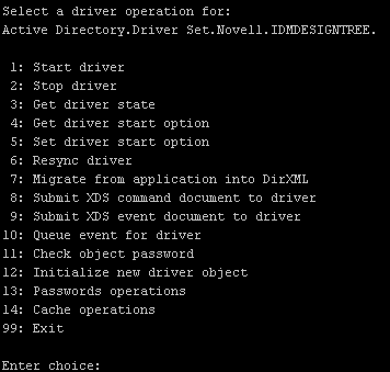 The interactive mode provides a text interface to control and use the DirXML Command Line utility.
