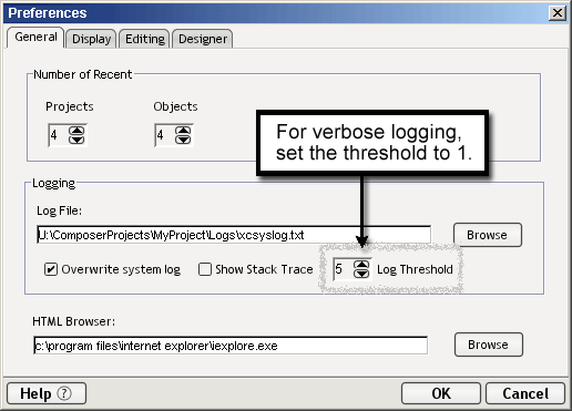 Priority levels for individual Log Actions can be set in the Log Action dialog. The reporting threshold is set in the General tab of the Preferences dialog (as explained below). Once a threshold value is set, only Log Actions of equal or greater priority will execute. For example, if Log Action A has a priority setting of 4 and Log Action B has a priority of 9, and the threshold setting in the Preferences dialog is 8, then at runtime only Log Action B will execute. Log Action A will be ignored.