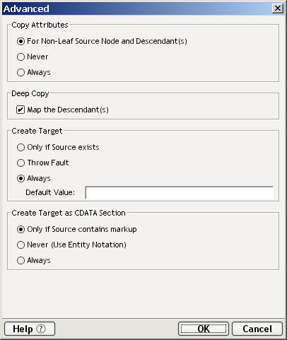 AlwaysDefault behavior. (Target node is always created.) When this button is selected, the nearby Default Value text field becomes enabled so that you can optionally enter a default data value for the target element.