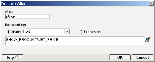 In the above example, the Input Part has a node called SHOW_PRODUCT/LIST_PRICE. Rather than type $Input/SHOW_PRODUCT/LIST_PRICE repeatedly throughout the action model, one could, for convenience, assign an alias (an arbitrary name) to the XPath expression. In this case, the alias "aPrice" has been assigned to $Input/SHOW_PRODUCT/LIST_PRICE. From this point on, throughout the action model, one can use "aPrice" instead of $Input/SHOW_PRODUCT/LIST_PRICE. At runtime, the alias will be expanded to the complete XPath.
