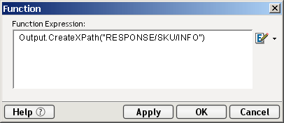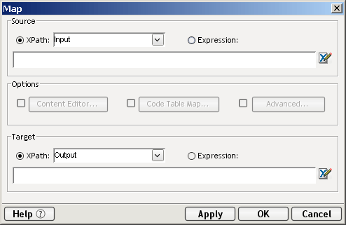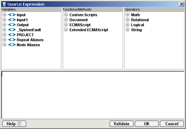 If you have chosen the Expression radio button, type the appropriate ECMAScript representation of the target XPath in the text field, or click the Expression Builder icon (to the right of the text field) and use the Expression Builder pick-lists to build an expression.