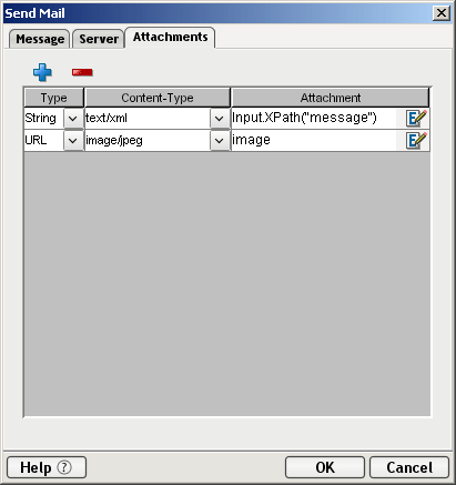 Under Attachment, enter the ECMAScript expression that will serve as the attachment content (if you chose String under Type) or as the URL to the file you wish to send. In the example above, the first attachment is a String consisting of the data associated with the /message node of the component's Input document. The second attachment (a JPEG image) specifies a URL string contained in the previously declared ECMAScript variable named "image." The variable in question could resolve at runtime to something like "file:///d:/server-1/resourcestore/images/stockimage.jpg."