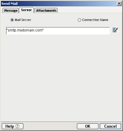 Click the Mail Server radio button if you wish to specify an ECMAScript expression that will resolve to your mail server's address (as shown above). Alternatively, click the Connection Name radio button if you wish to use a server that has been specified in a "Mail via SMTP Simple Authentication" connection resource. (See the discussion of this resource type at "Mail via SMTP Simple Authentication" earlier in this section.) You would use the latter option in cases where user authentication (via username and password) is required in order to access the server.