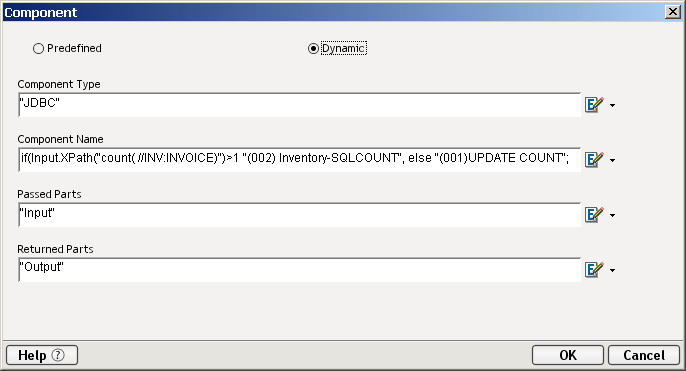 You can specify these parameters in one or two ways: Predefined or Dynamic. A Predefined Component action populates the four parameters with values derived from the current state of the project. Once specified, these values remain fixed for all executions of the action unless you manually change them. A Dynamic Component action populates the four parameters at runtime with values calculated from expressions you create. This allows the Component action's behavior to be flexible and vary based on runtime conditions each time it is executed. One Component action can execute a different component depending on various runtime conditions, or pass in different Input documents, or receive results into different result documents.