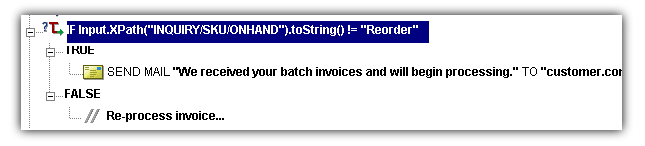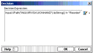 The Decision action creates an if. . . then branching between actions or group of actions. You use a Decision action to select one branch or another, based upon a condition you supply. The condition must use an ECMAScript comparison operator, such as = =, <, >,!, >=, <=, (&), OR (||), or <>. The expression must resolve to the Boolean true or false statement. For instance, you can check to see if an invoice is older than a certain date and send an e-mail if it is.