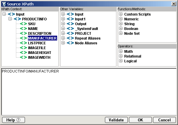 When you are in the Map Action dialog, you can build your own XPath expressions by choosing the Expression Builder button at the far right of the appropriate text field. The XPath Expression Builder dialog that appears will display pick-lists to help you construct valid XPath syntax in point-and-click fashion. This can be especially handy when you wish to go beyond basic XPath addressing and use some of the more powerful features of XPath.