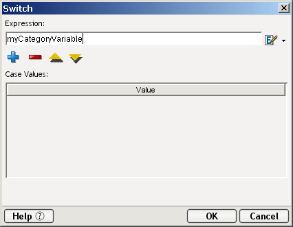 In the combo box, enter the static string values or the ECMAScript expressions that will be checked against the input value that you specified in the previous step. Remember that at runtime, each Case value will be checked in turn, in the order you list them. (Tip: For optimal performance, list the most likely matches first.)