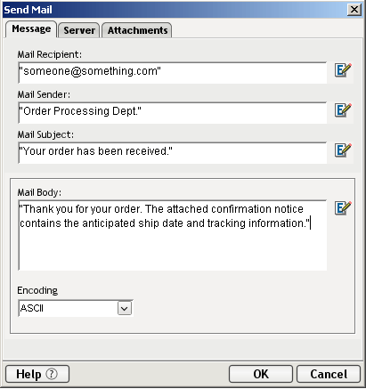 In the Mail Body field, type a valid ECMAScript expression to specify the e-mail body text (or type the body text enclosed in quotation marks).