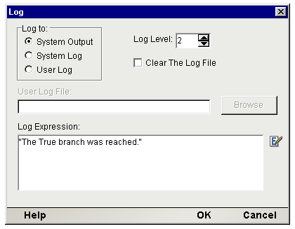 The System Output option writes out messages you specify in the Log Expression field to the Java Virtual Machine process window at design time or the Application Server console at runtime.