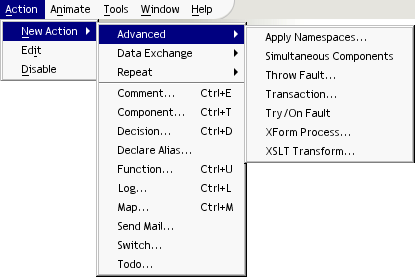 Integration Manager provides actions with the basic XML Map component. These actions are also available for all other component types, such as JDBC Components, JMS Components, etc. Actions are grouped on the Action menu as Basic Actions and Advanced Actions. The following table lists the suite of basic actions available in Integration Manager. The Advanced Actions are described in the next chapter.