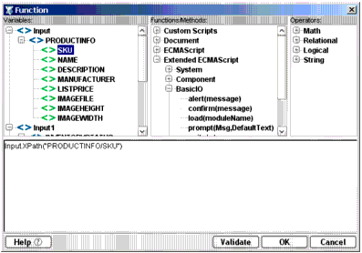 Type the function in the Function Call field or click the Expression Builder button to build an ECMAScript expression (discussed below). Function calls are case sensitive. Also, if the function requires parameters, make sure to include them in the function call.