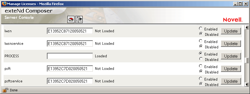Type a license string in the text field in the "lwsnservice" row; then select Enabled in the "lwsnservice" row. To use the evaluation license string, just select Enabled.