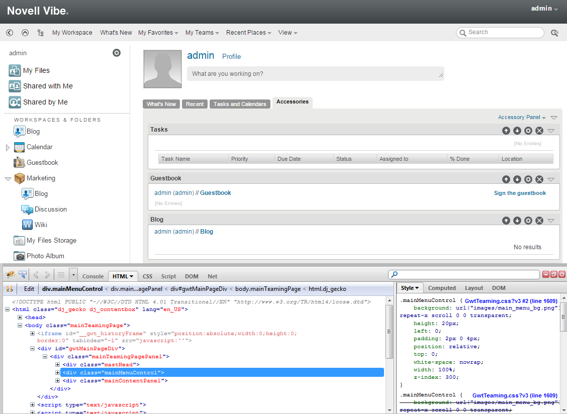 For example, suppose you want to modify the color or font of the Action toolbar for your Vibe site. You use Firebug on Firefox to find the selector name for the Action toolbar, which is mainMenuControl.