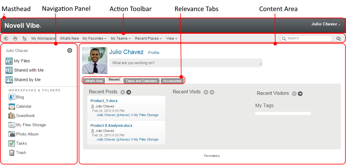 Figure 4-1shows the various areas of the Vibe interface. The type of files that you need to modify in order to affect Vibe styles depends on the area of the Vibe interface that you want to customize, as shown in the following table.